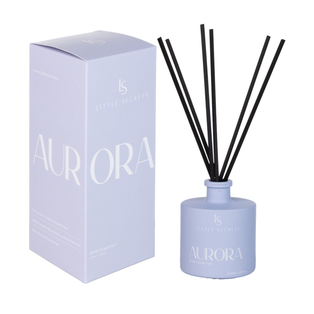 Οικολογικός αρωματιστής χώρου, Aurora Home Diffuser, χωρίς αλκοόλ, σε γυάλινο δοχείο με έξι stick καινοτομικά σχεδιασμένα για υψηλή απόδοση διάχυσης αρώματος με νότες ροδάκινου, βανίλιας και σανταλόξυλο.