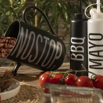 Δοχείο σάλτσας Bigismore Από πλαστικό (LDPE, EVA, PP) Βιδωτό καπάκι Για καρύκευμα, δοσολογία και διακόσμηση Χωρητικότητα: 480 ml Με επιγραφή "BBQ" Bigismore Πλύσιμο στο χέρι Δεν είναι κατάλληλο για φούρνο μικροκυμάτων Διαστάσεις: Ø 6 x υ. 23 cm Χρώμα: μαύρο με λευκή επιγραφή