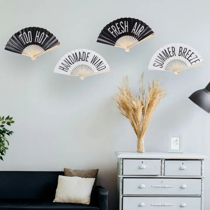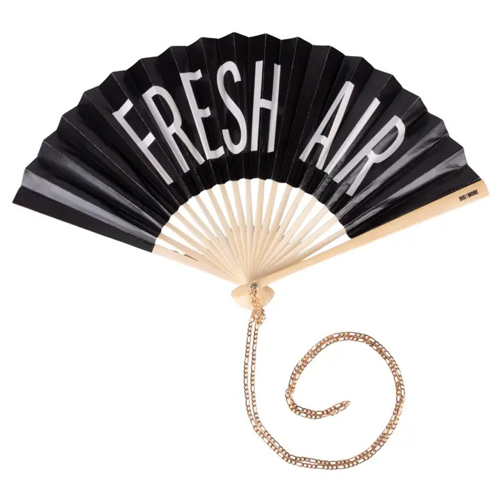 βεντάλιαBigismore Από πολυεστέρα και βαμβάκι Λαβή από μπαμπού Σιδερένια αλυσίδα Με την επιγραφή: "FRESH AIR" Χρώμα: μαύρο με λευκή επιγραφή Διαστάσεις ανοιχτής βεντάλιας : πλ. 41,5 x β. 21,4 εκ. Διαστάσεις κλειστής βεντάλιας : πλ. 29 x β. 2,4 x υ. 1,5 εκ.